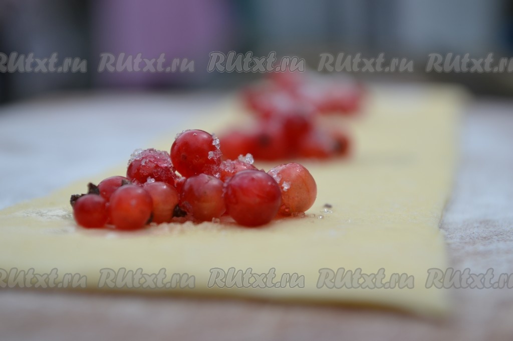 Тесто раскатать в тонкий пласт квадратной формы и разрезать на две равные части. Выложить на одну из них подготовленную смородину и посыпать сахаром. Выкладывать необходимо на одинаковом расстоянии кучками, примерно, по столовой ложке ягод.