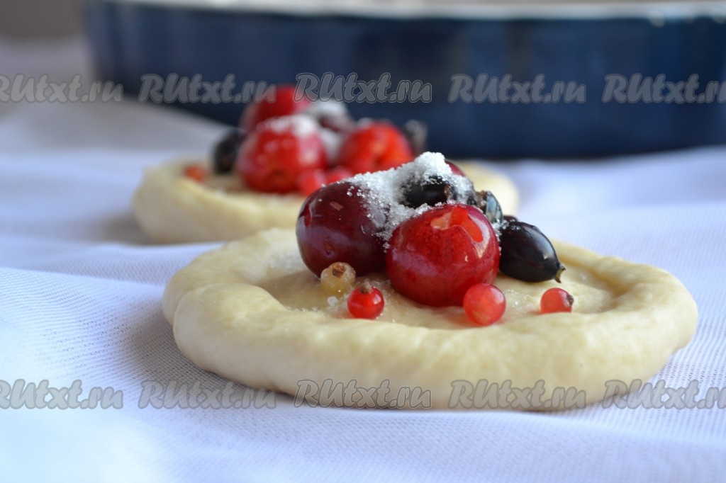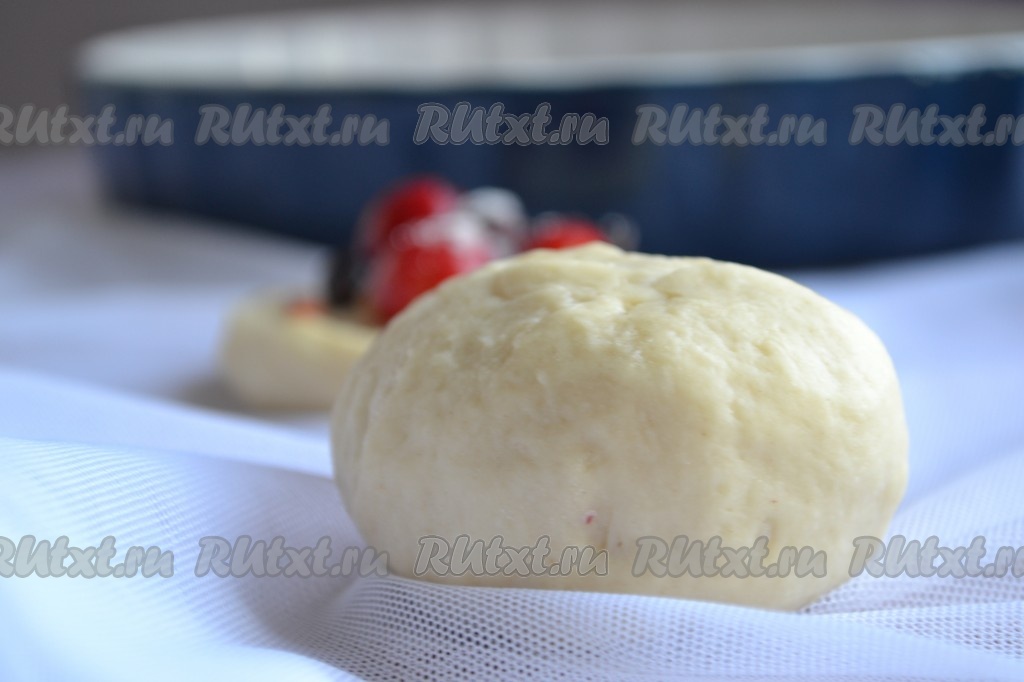 Из такого дрожжевого теста можно испечь просто пышные булочки без начинки или булочки со сладкой начинкой. Я выбрала второй вариант. Ягоды вымыть, выложить на салфетку, чтобы избавиться от лишней влаги. Подошедшее тесто обмять. Тесто скатать в валик и нарезать на равные части по количеству будущих булочек. Если будете печь булочки без начинки, то просто скатайте каждую часть теста в шар. Если будете готовить с начинкой, тогда каждую часть теста нужно слегка раскатать скалкой в лепёшку, в центр выложить ягоды (или кусочки фруктов) и присыпать начинку сверху сахаром (количество сахара регулируйте по вкусу, исходя из сладости ягод или фруктов).