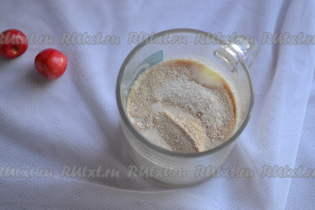 Все ингредиенты, необходимые для замешивания теста, должны быть комнатной температуры, свежими и качественными. Первым делом следует сделать опару для теста. Для этого сухие дрожжи, одну столовую ложку сахара и одну столовую ложку муки всыпать в 200 мл молока комнатной температуры, перемешать и оставить минут на 15 в тёплом месте.
