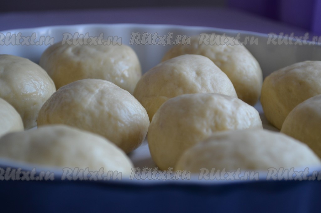 Все сформированные булочки выложить швом вниз в форму, смазанную маслом на расстоянии друг от друга, накрыть и оставить на 20 минут для подхода.