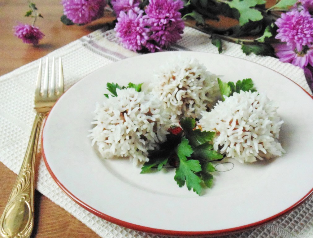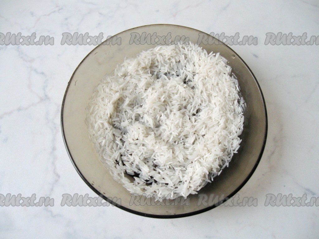 Рис промыть водой, дать лишней воде стечь, затем вложить на тарелку.