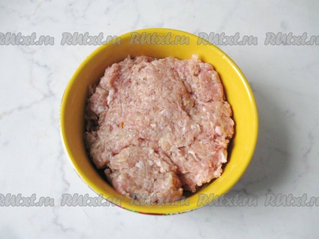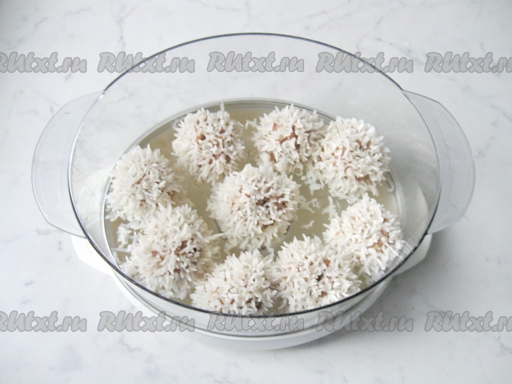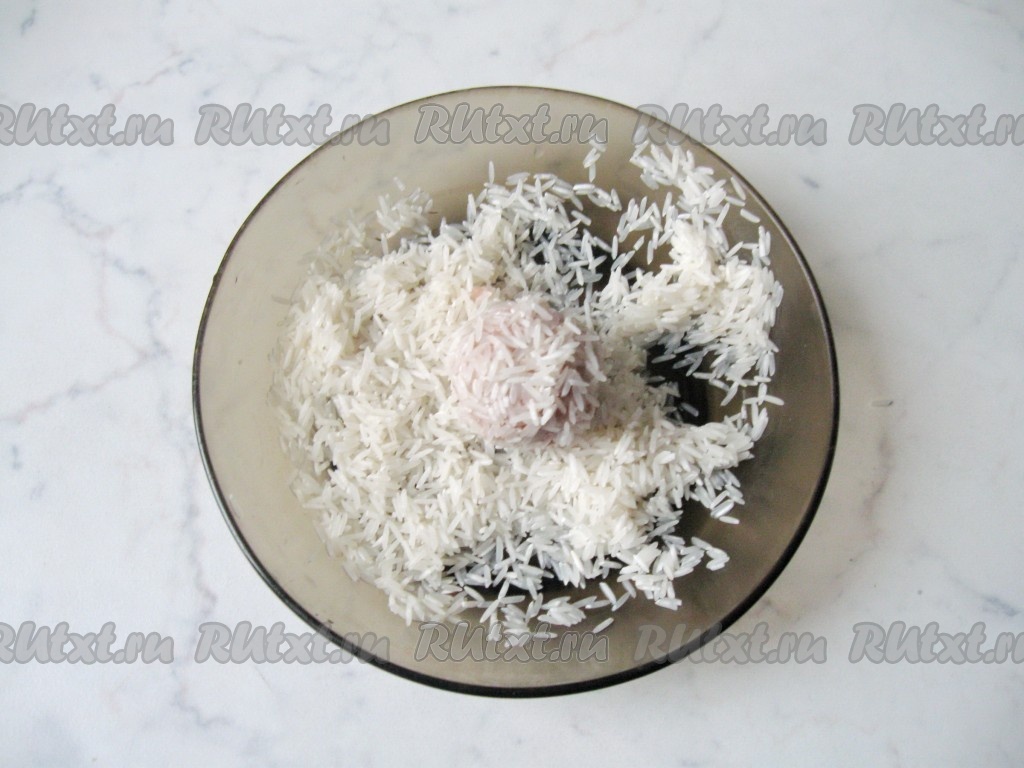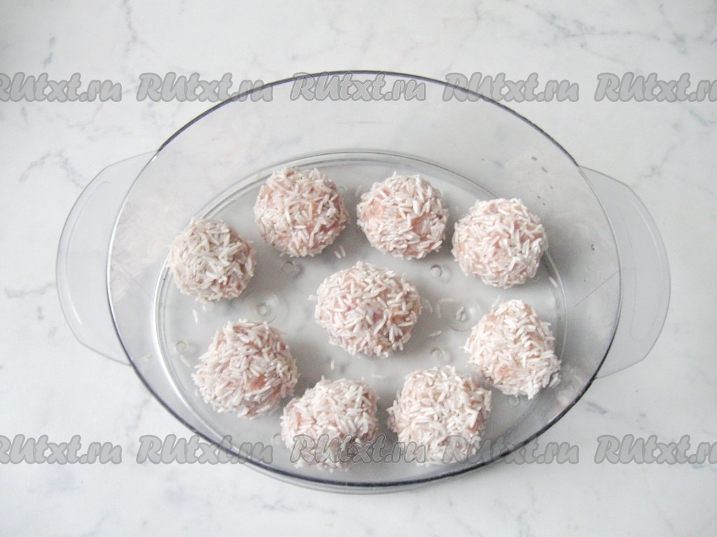 Из фарша влажными руками сформировать небольшие шарики (я сформировала 9 штук), затем выложить их в тарелку с рисом.