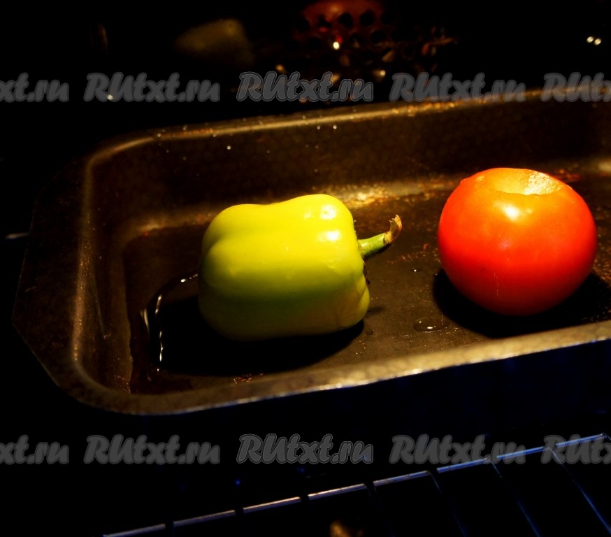 Перец и помидор поставить запекаться в духовку на 20 минут при температуре 180 градусов. В форму налейте немного воды.
