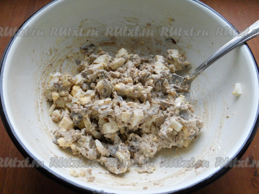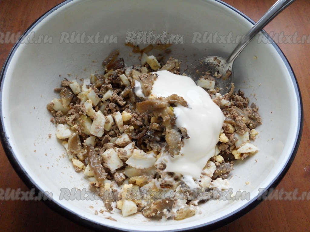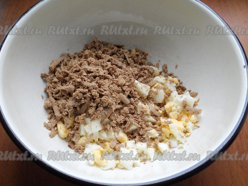 Яйца сварить вкрутую, остудить, очистить, нарезать кубиками. Добавить натертую на крупной терке отварную куриную печень.
