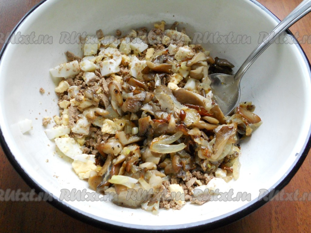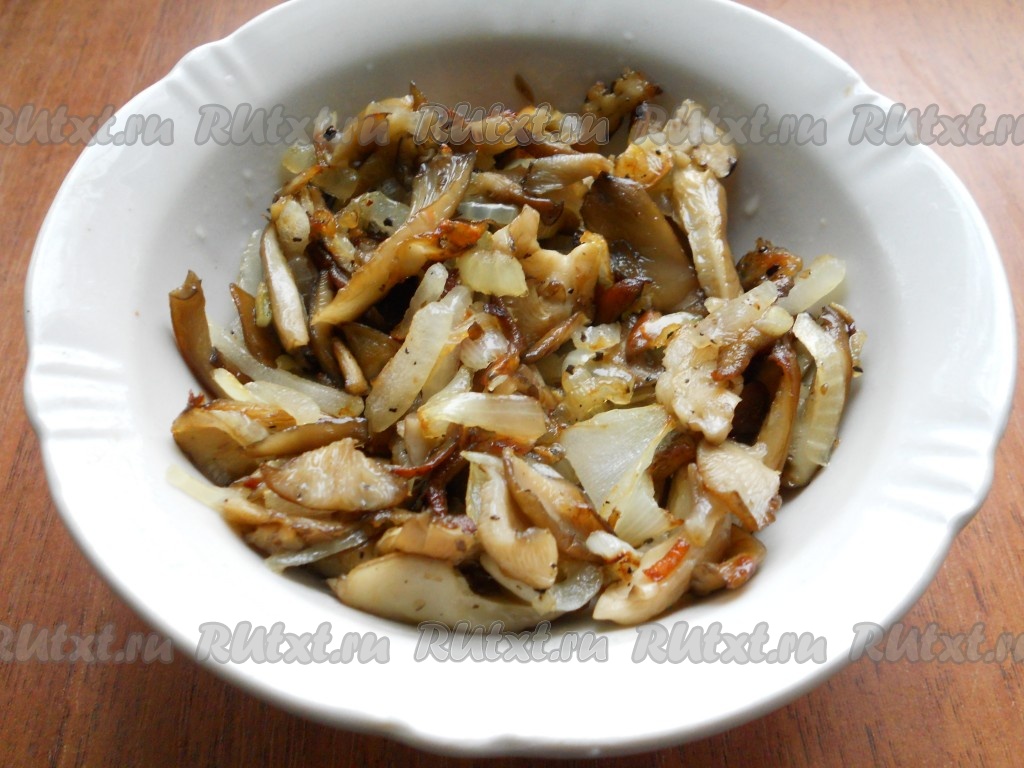 Грибы (я использовала вешенки, можно - шампиньоны) нарезать соломкой или пластинами (не мелко). Обжарить их с нарезанным соломкой репчатым луком на растительном масле, периодически помешивая. Посолить немного и поперчить. Если использовать вешенки, их нужно готовить не менее 10-15 минут, если шампиньоны - минут 5-7.
