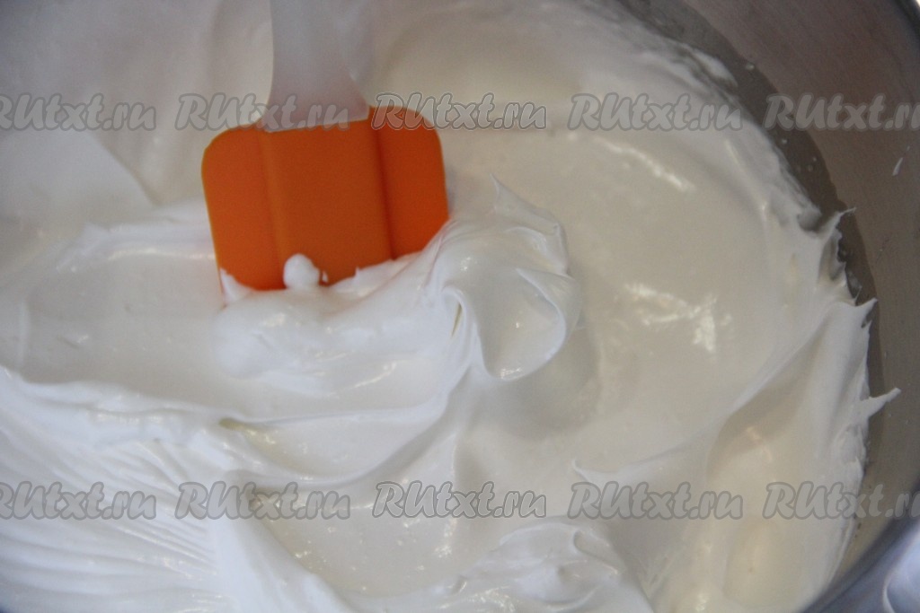 Затем, продолжая взбивать белки, постепенно всыпать сахар. Взбивать белки с сахаром до стойких пиков и полного растворения сахара. Белковая масса увеличится в объёме, станет блестящей, плотной и будет хорошо держать форму.