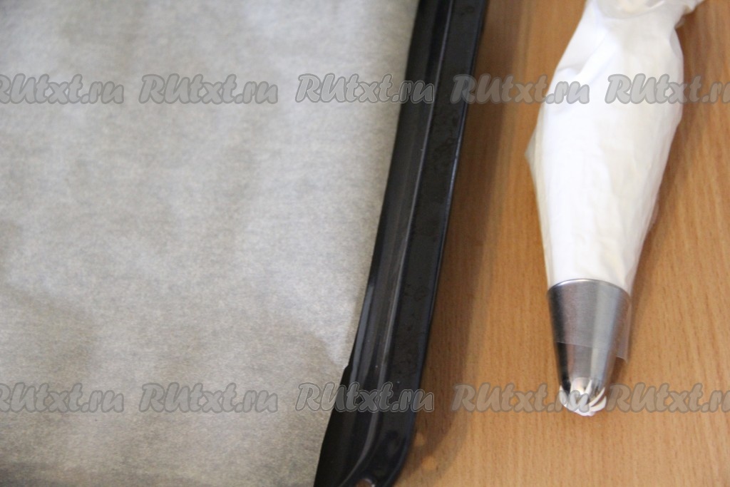 Противень для выпекания застелить пергаментной бумагой. Белковую массу переложить в кондитерский мешок с фигурной насадкой.