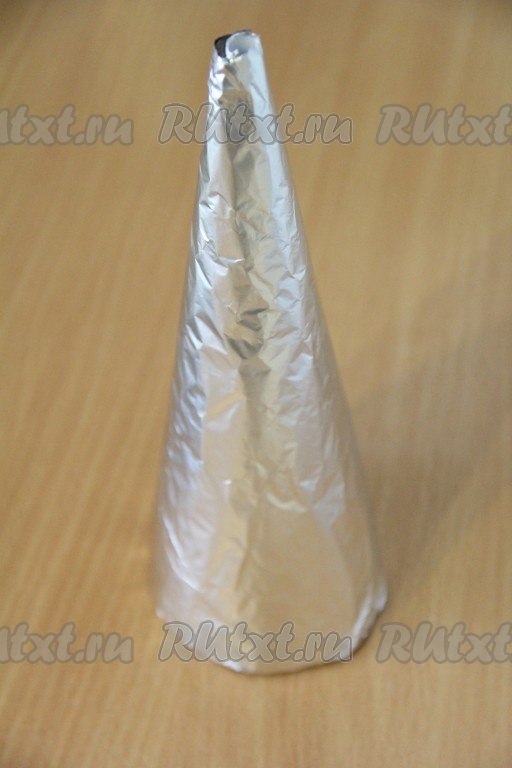 Приготовить каркас для нашей ёлочки. Из плотной бумаги сделать конус, а затем обвернуть его пищевой фольгой. Высоту и ширину ёлочки определяйте сами.