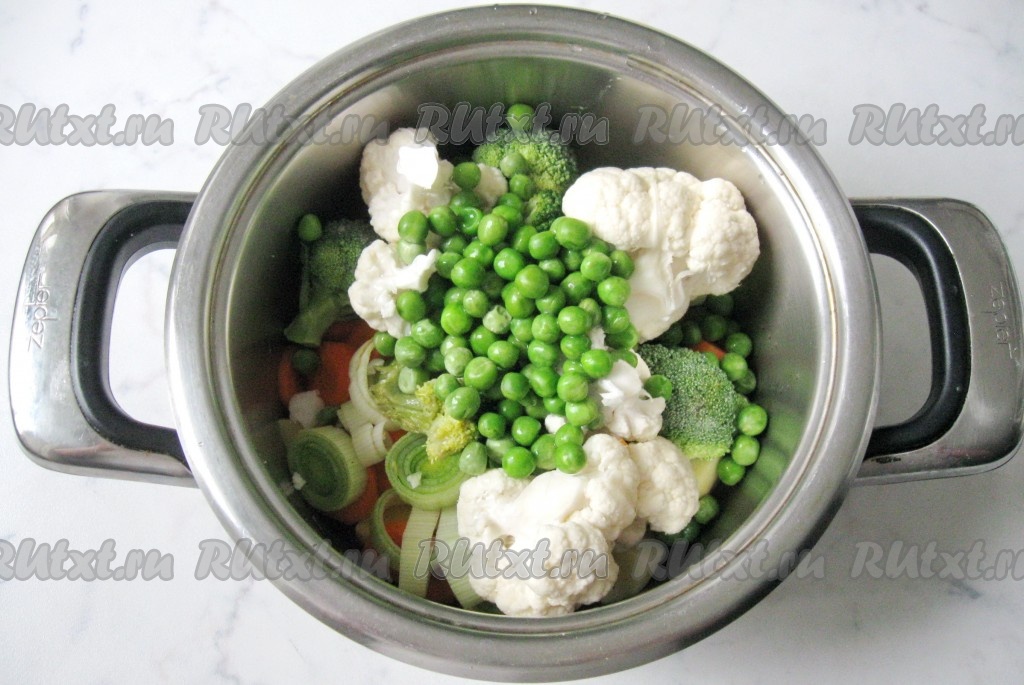 В кастрюлю налить воду так, чтобы она чуть покрывала все овощи (примерно 600 мл воды). Накрыть кастрюлю крышкой и варить 20-25 минут до готовности всех овощей.