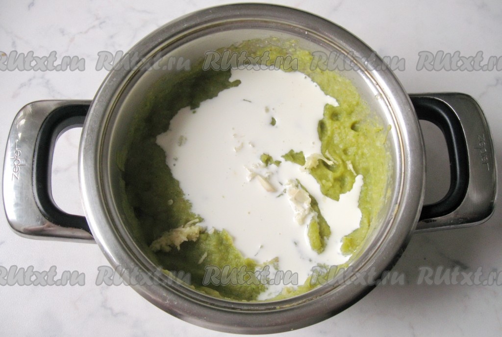 Суп посолить и поперчить по вкусу. Если суп-пюре будете давать детям, то перчить не надо. Добавить сливки и перемешать.