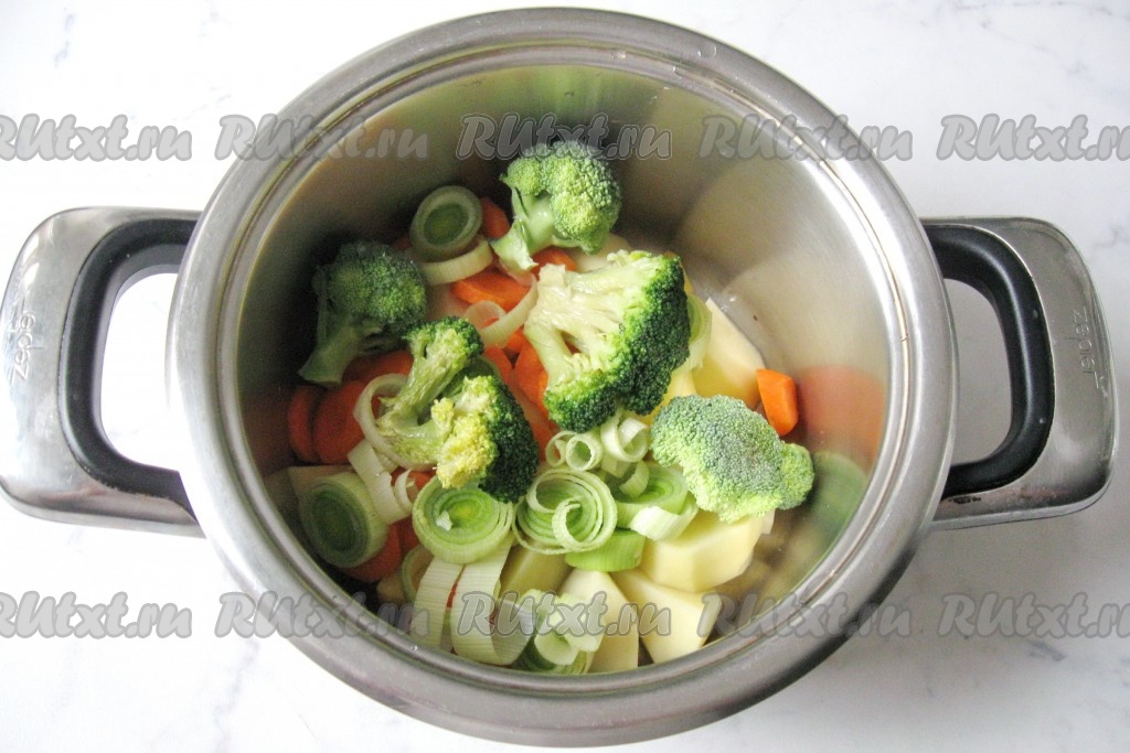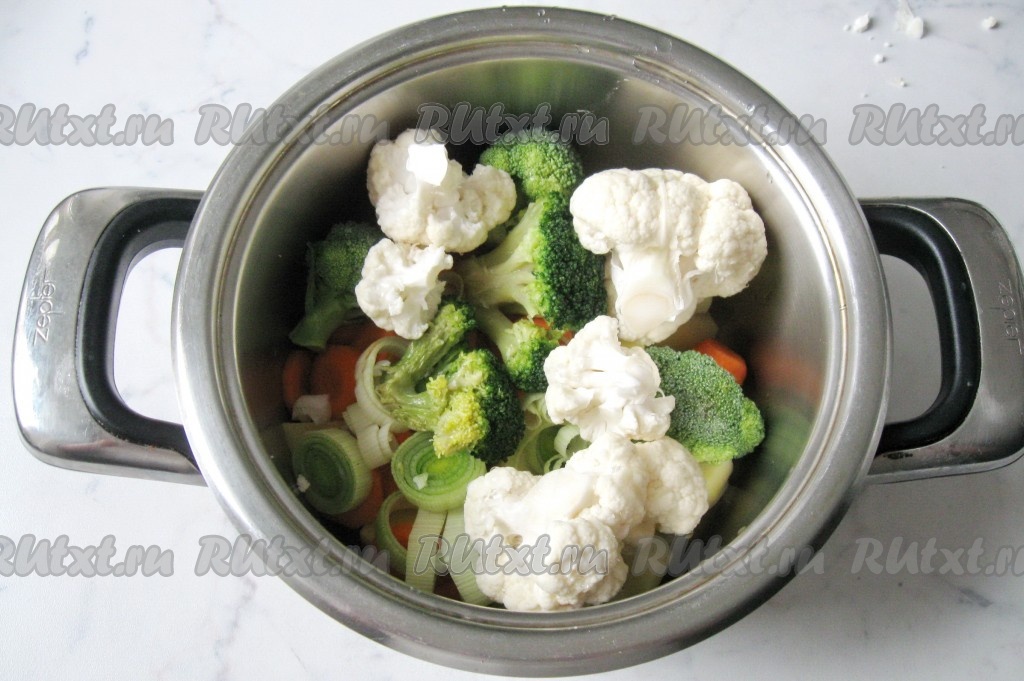 Брокколи разобрать на соцветия, помыть и добавить в кастрюлю к остальным овощам.