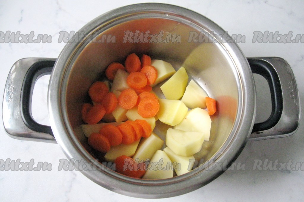 Морковь почистить, помыть и нарезать. Добавить в кастрюлю к картофелю.