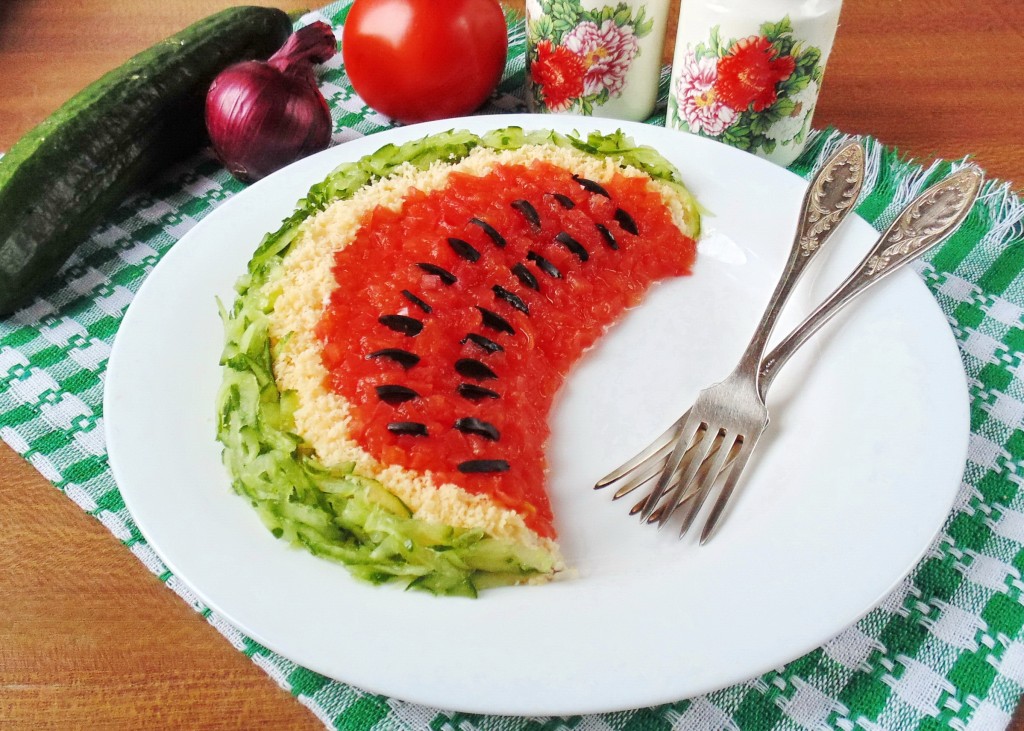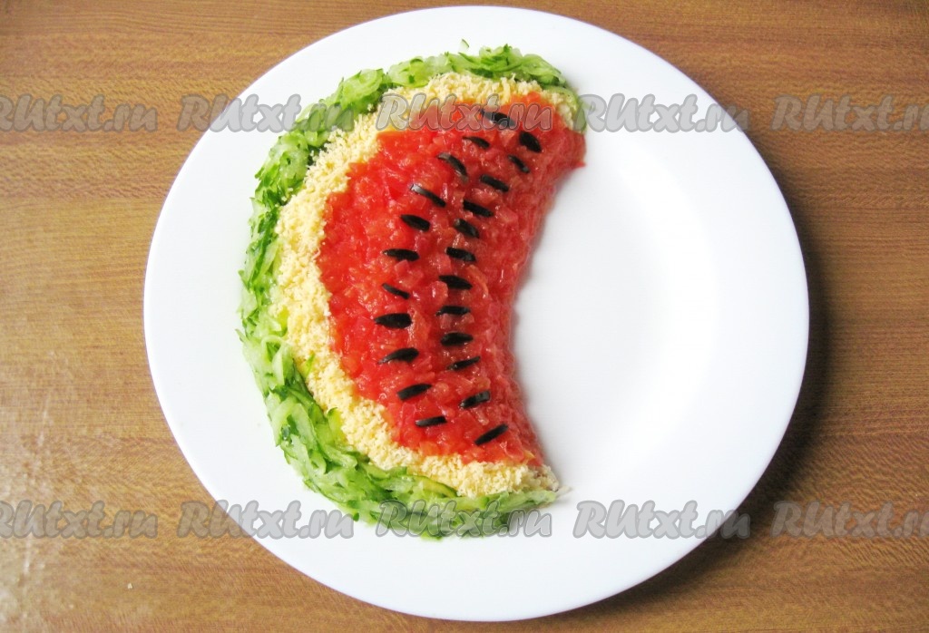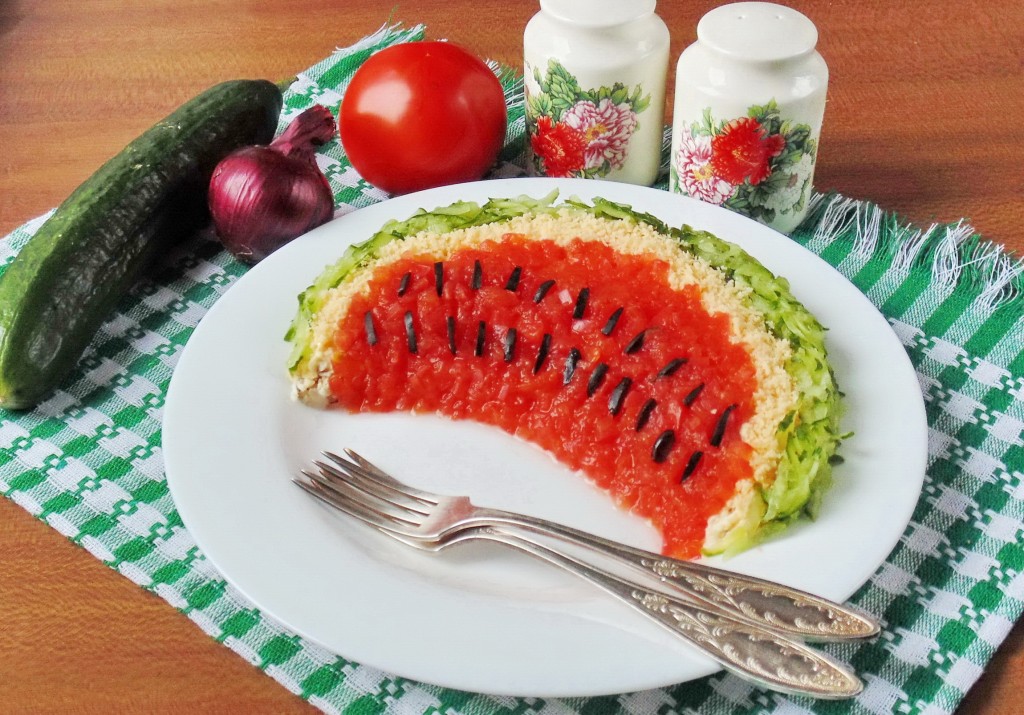Яркий, вкусный салат "Арбузная долька" с курицей готов. Подаем на праздничный стол в качестве закуски.