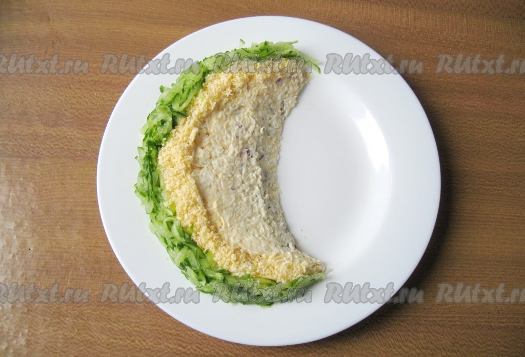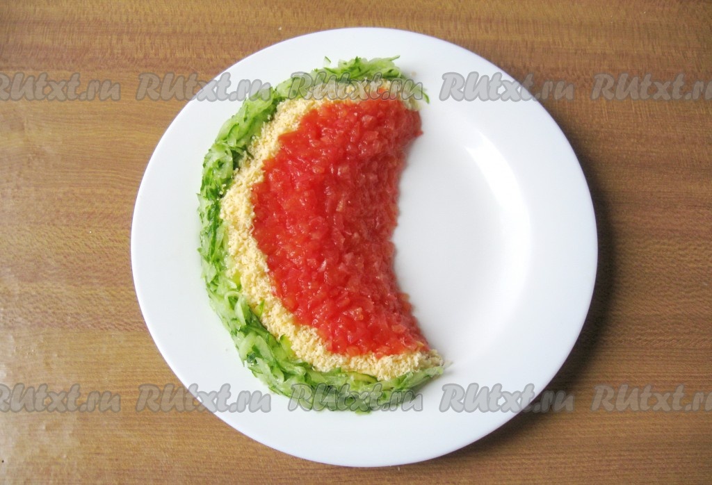 Огурец помойте и натрите на крупной терке. Выложите зелёную часть "арбуза".