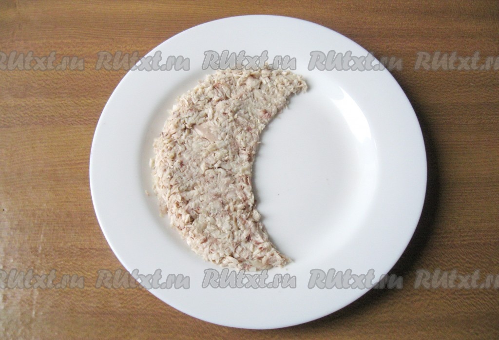 Лук очистите и помойте. Мелко нарежьте и выложите на слой майонеза. Если лук не сладкий (не салатный), нарежьте его и обдайте кипятком для удаления горечи. Слои салата кладите, увеличивая его высоту к наружному краю, оставляя внутреннюю часть тонкой. Таким образом вы сформируете арбузную дольку.