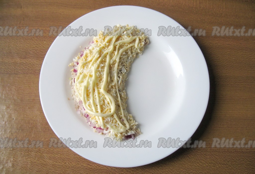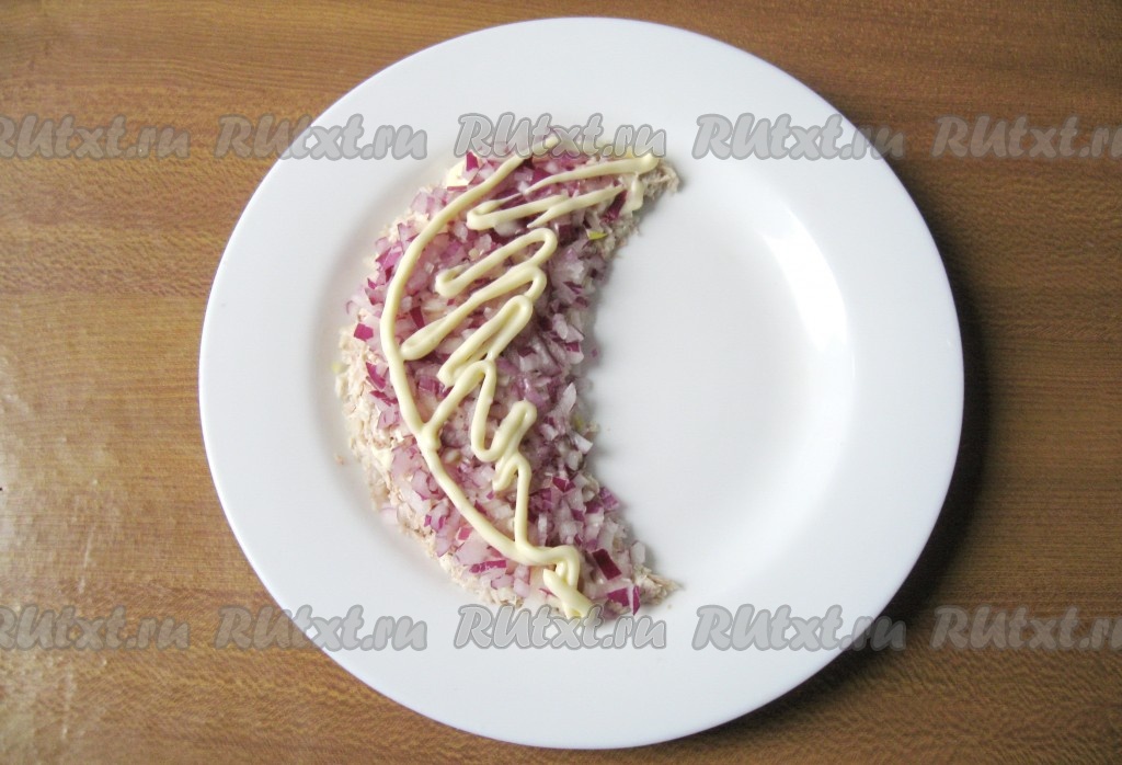 Нарезанный лук также покройте майонезом.
