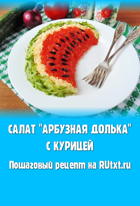 Салат "Арбузная долька" можно приготовить из любых ингредиентов по вашему вкусу, поскольку в данном рецепте акцент делается на оформление блюда. У меня он с куриным мясом, которое хорошо сочетается с отварными яйцами, сладким красным луком и сыром. Готовится салат "Арбузная долька" с курицей очень просто и относительно быстро. В преддверии праздников, надеюсь, что этот способ украшения блюда многим пригодится. Количество указанных ингредиентов рассчитано на две порции салата.
