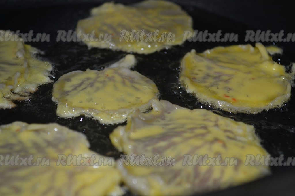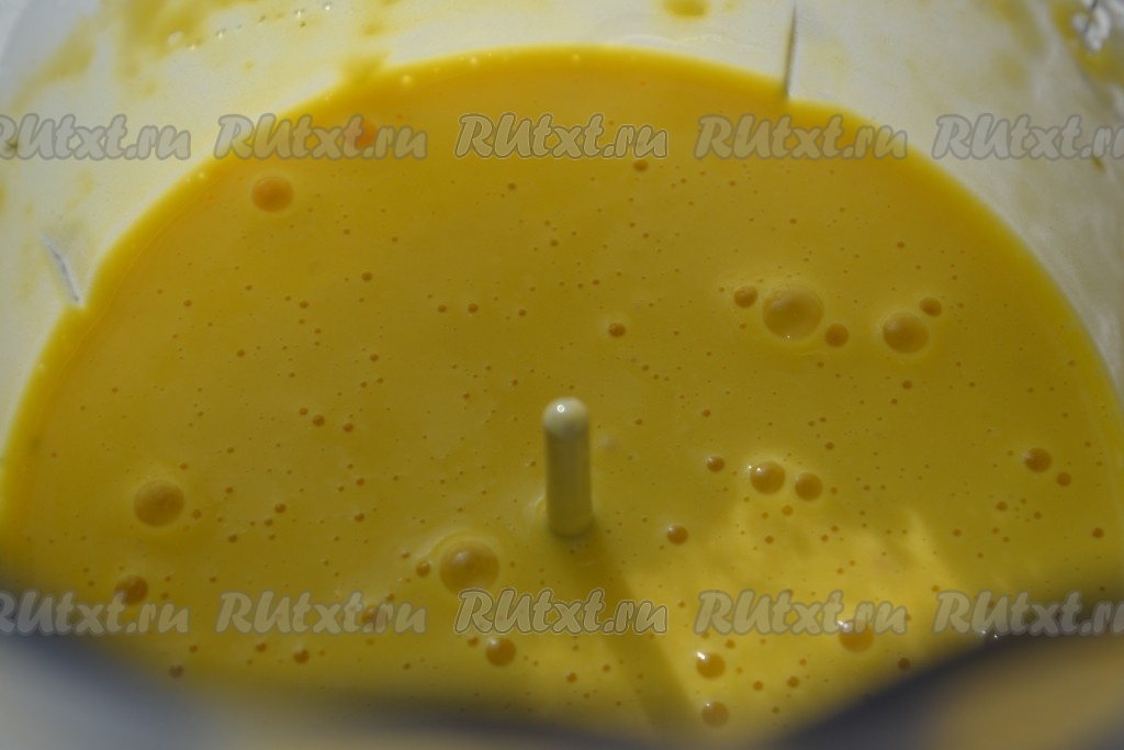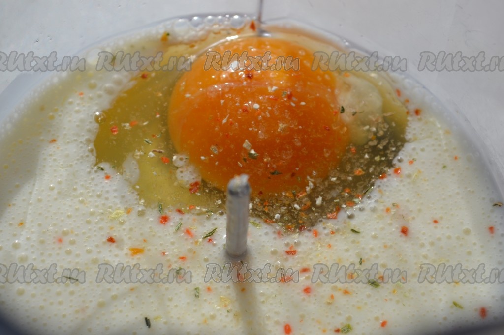 Всыпать муку и взбить кляр до однородности (я взбила блендером, можно взбить венчиком). Кляр не должен быть жидким, но и слишком густым он быть не должен.