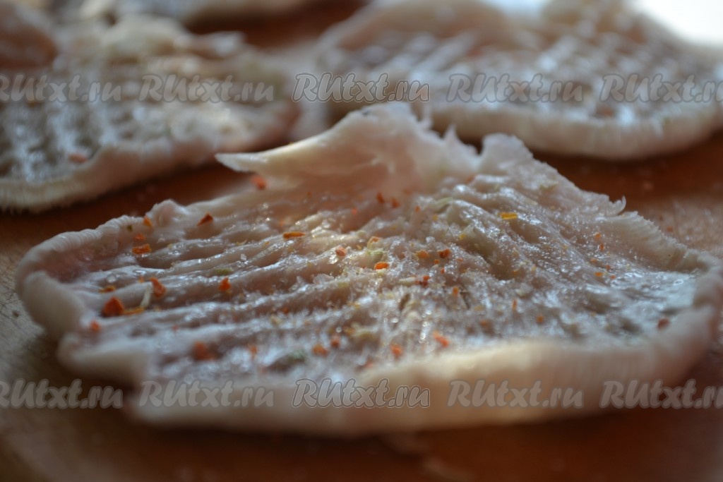 Поперчить, посыпать приправами и присолить по вкусу отбивную из вешенки.