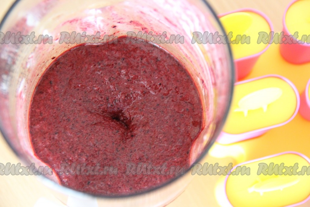 Разложить получившуюся массу по формочкам, вставить палочки. Поставить формочки в морозильную камеру на ночь.