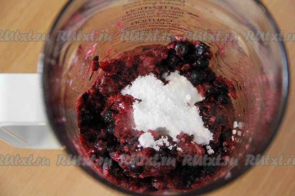 Пробить ягоды с бананом в пюре. Затем добавить сахарную пудру и лимонный сок, ещё раз пробить.
