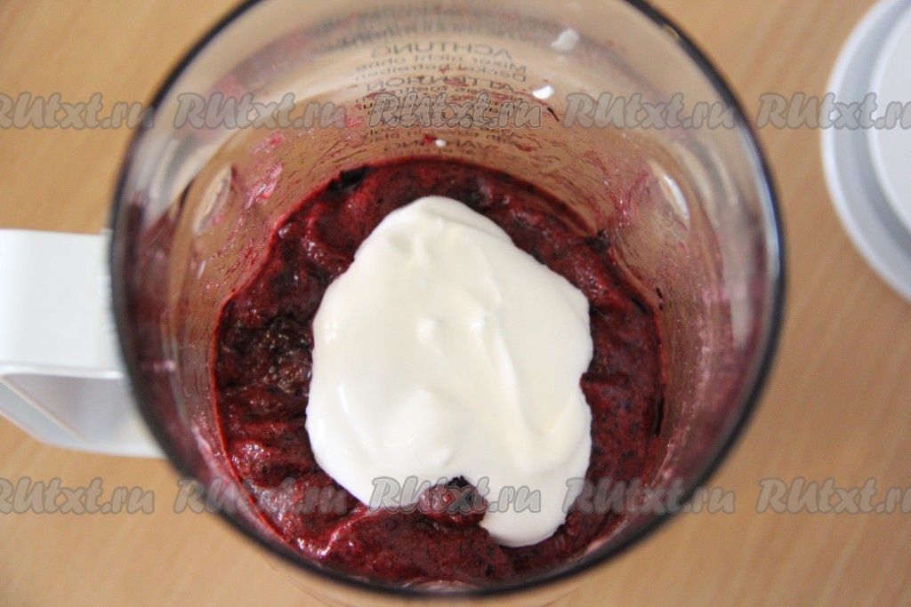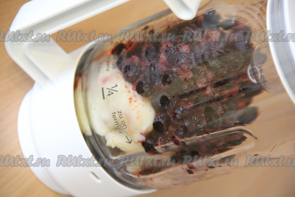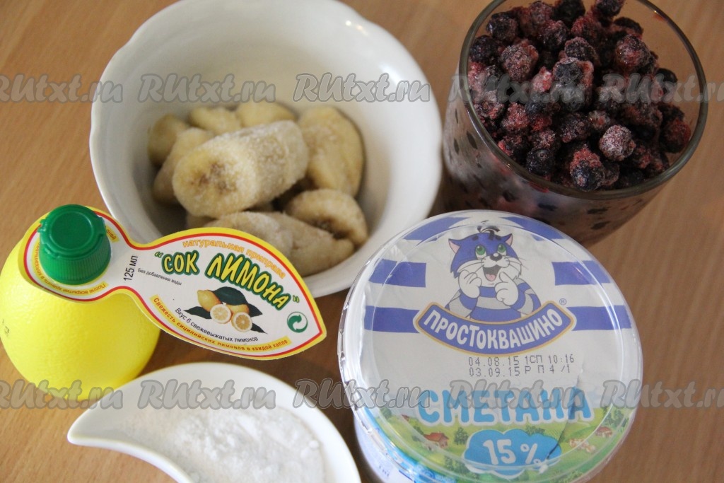 Если используете свежие ягоды, то предварительно заморозьте их в течение 1-2 часов. Бананы почистить, нарезать на кусочки и положить в морозилку на 1-2 часа. Сметану можно взять любой жирности.