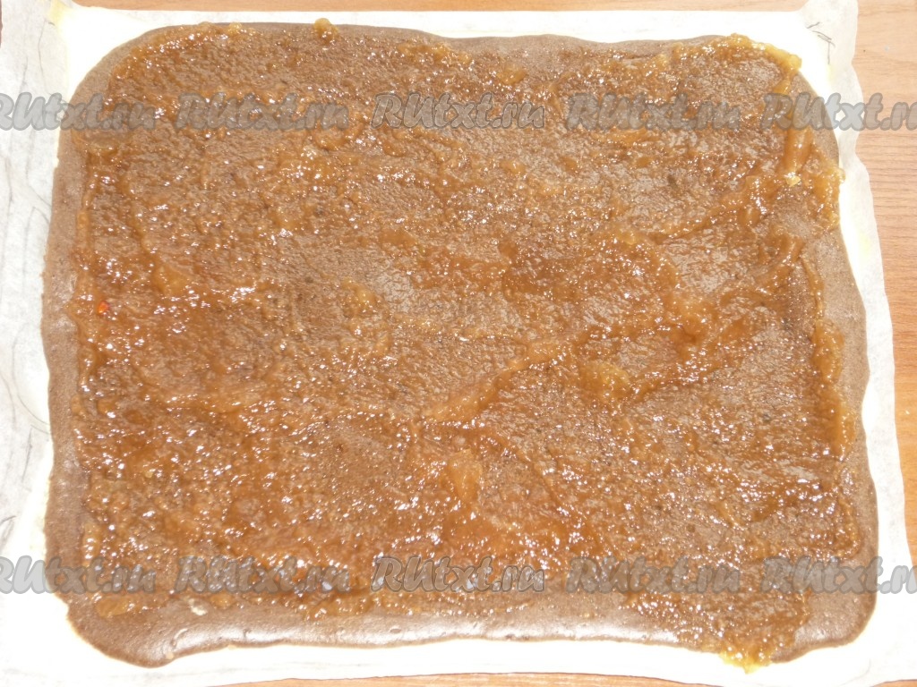 Готовый корж достаём из духовки и смазываем любимым повидлом. Сворачиваем его с помощью бумаги, на которой он выпекался.