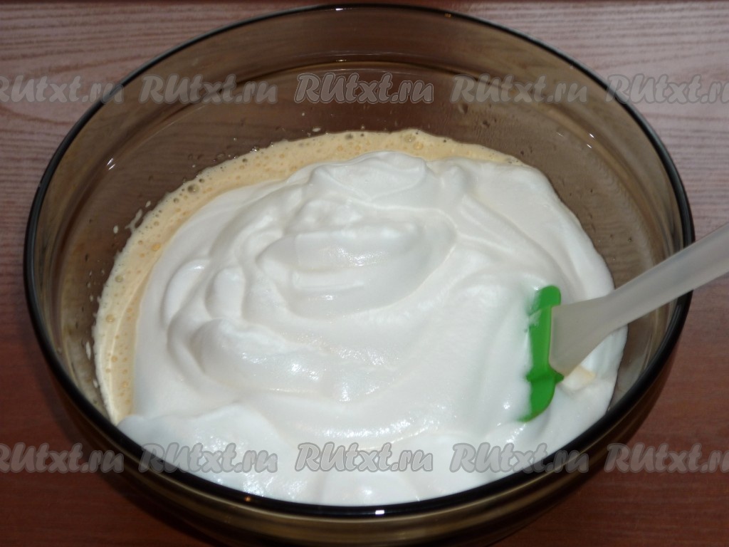 Теперь осторожно соединяем белковую и желтковую массы, добавляем просеянную муку. С помощью силиконовой лопатки аккуратно перемешиваем, чтобы не вышли пузырьки воздуха. Бисквитное тесто должно получиться воздушным, однородным, в меру густым.