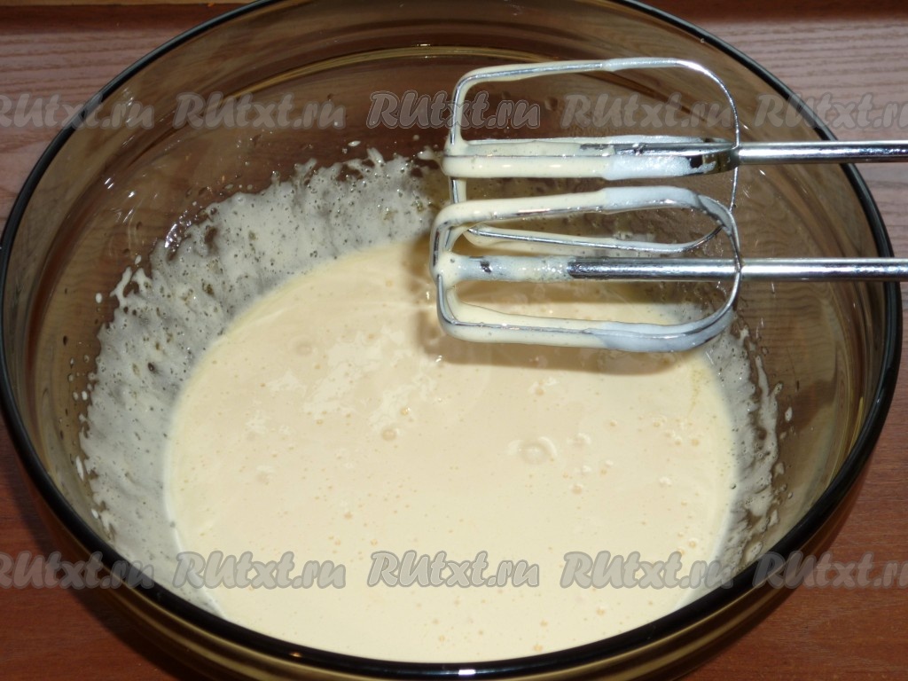 В другую объёмную сухую миску вливаем желтки, добавляем 70 грамм сахара,взбиваем миксером до побеления желтковой массы.