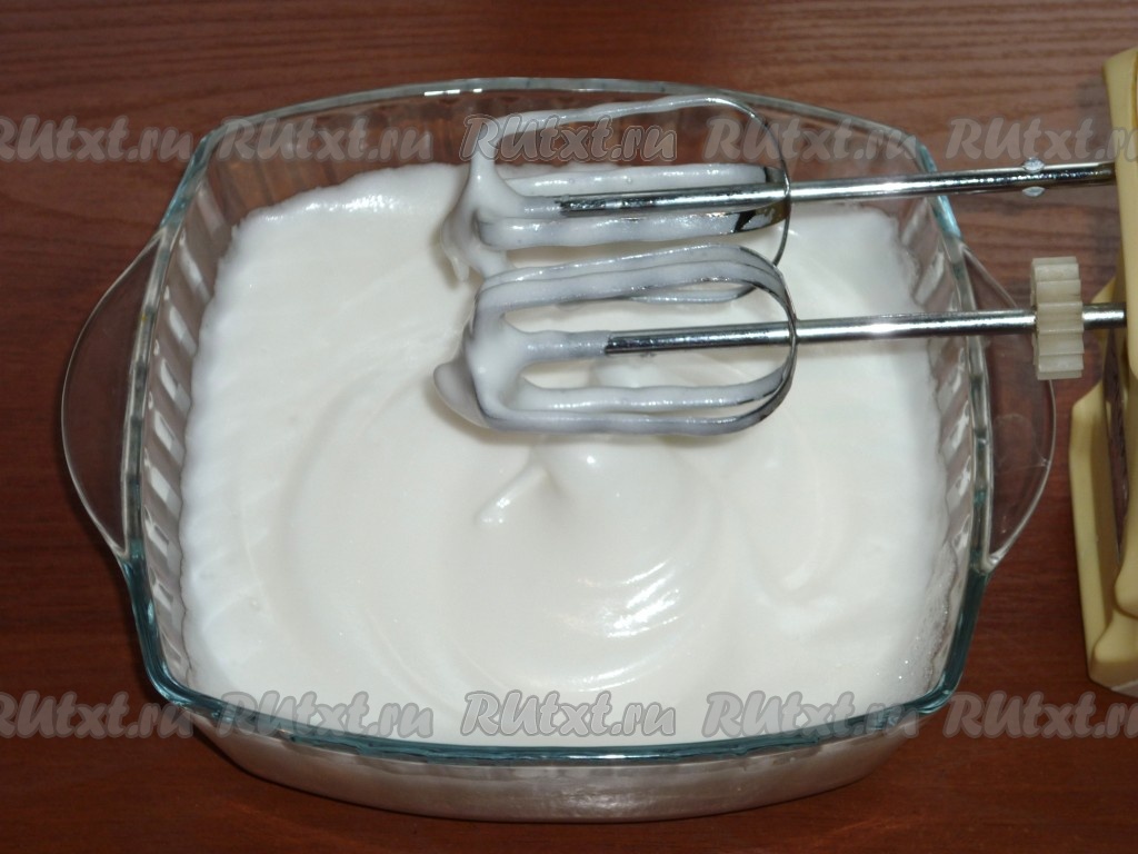 Теперь замесим бисквитное тесто, для этого аккуратно разделяем яйца на белки и желтки. Белки вливаем в сухую миску, удобную для взбивания, всыпаем 70 грамм сахара. Взбиваем белки миксером до устойчивой пены.