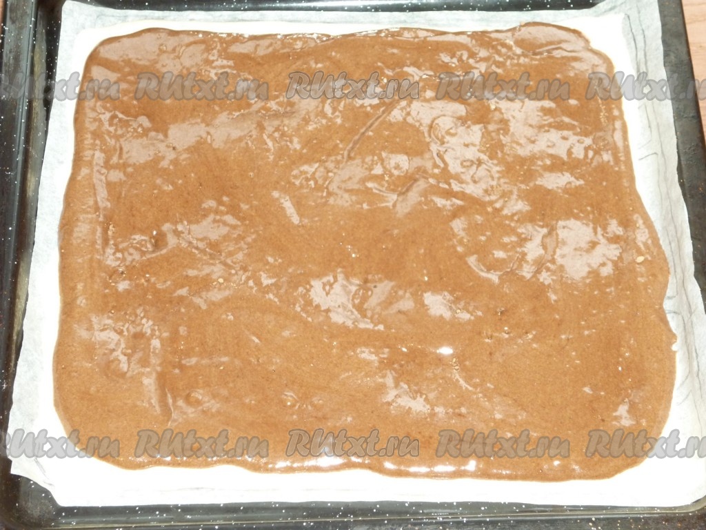 Духовку разогреваем до 180 градусов и отправляем противень с рисунком запекаться на 4 минуты. А пока в оставшуюся часть теста добавляем какао-порошок и перемешиваем лопаткой. Когда рисунок пропечётся, достаём его из духовки и аккуратно выливаем сверху шоколадное тесто. Выпекаем бисквитный корж в течение 10 минут.