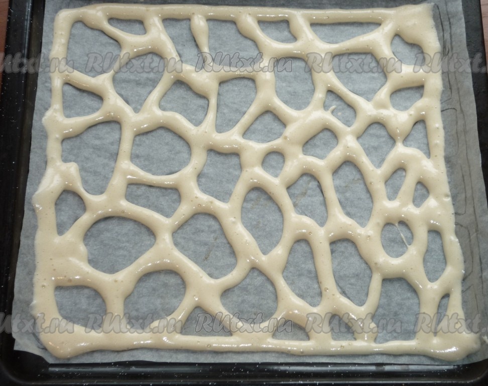 Часть теста помешаем в кондитерский мешок и выдавливаем его тонкой струйкой, повторяя рисунок, нанесённый на пергамент.