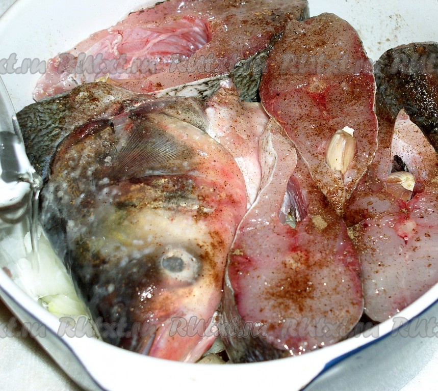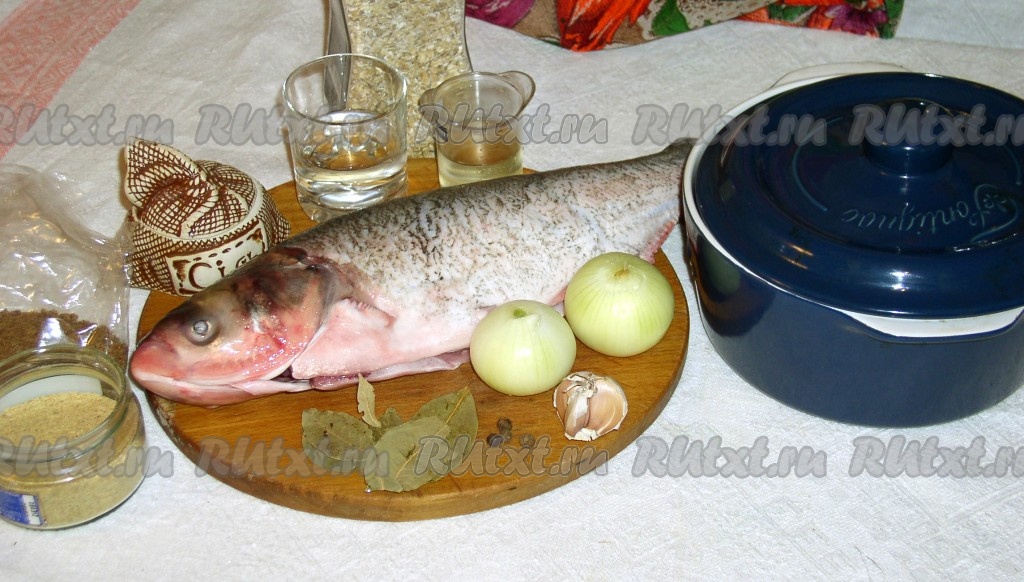Рыбу нарезать порционными кусками, слегка присолить и обтереть солью со всех сторон, но только слегка. Уложить плотно на дно кастрюли, присолить сверху и посыпать молотым мускатным орехом. В каждый кусочек воткнуть дольку чеснока в шелухе, а большой зубчик положить внутрь головы. Полить всю поверхность рыбы растительным маслом. Осторожно влить под край немного холодной воды.