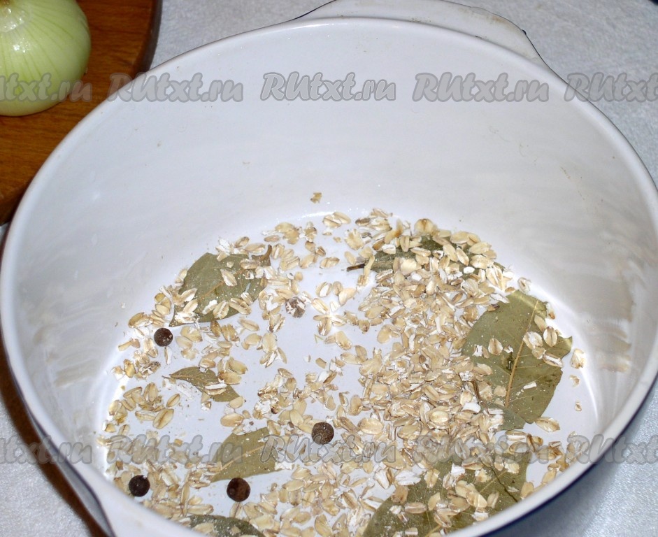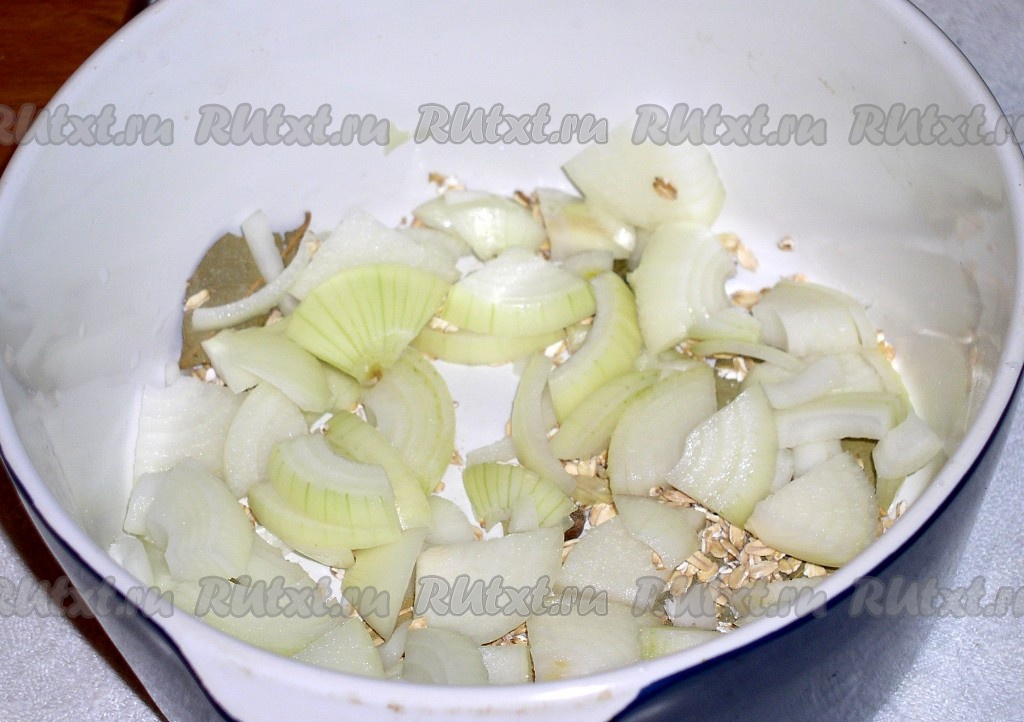На дно кастрюльки выложить лавровый лист, горошины душистого перца (по желанию) и ложечку овсяных хлопьев. Они предназначены для впитывания сока и создания вкусной эластичной подливки. Правда, попадаются разные по качеству хлопья и не каждый раз они превращаются в однообразный соус. Впрочем, можно обойтись и без хлопьев.