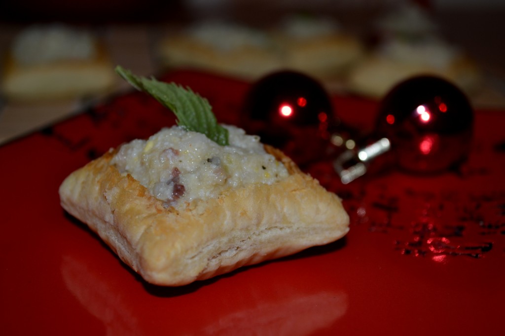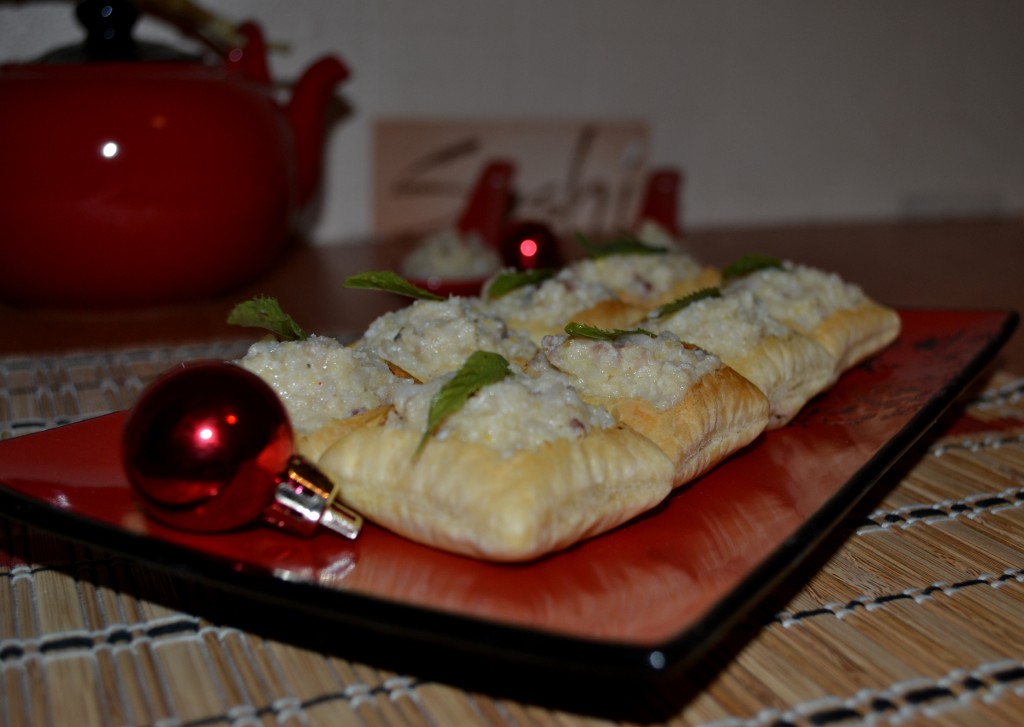 Теперь собираем закуску. Аккуратно, с помощью ножа, надрезать слойку, сделав корзиночку.