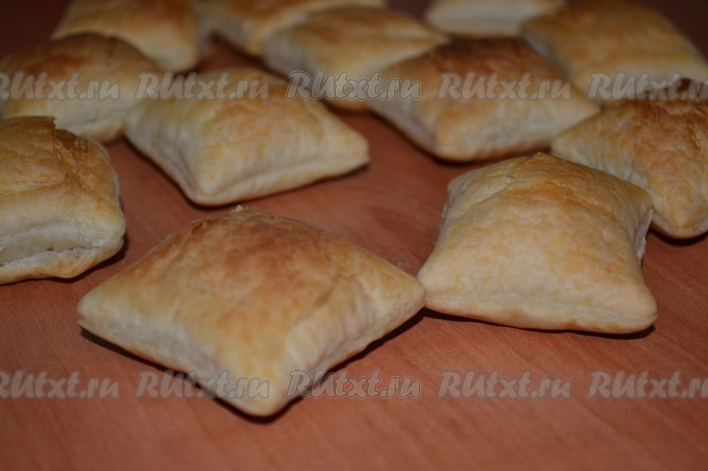 Очень простая и сытная закуска из готового слоеного теста. В качестве начинки я использовала сельдь, яблоко, яйца, лук и рис - отличное сочетание.