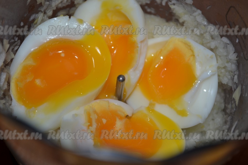 Отварить яйца "в мешочек" и измельчить в блендере.