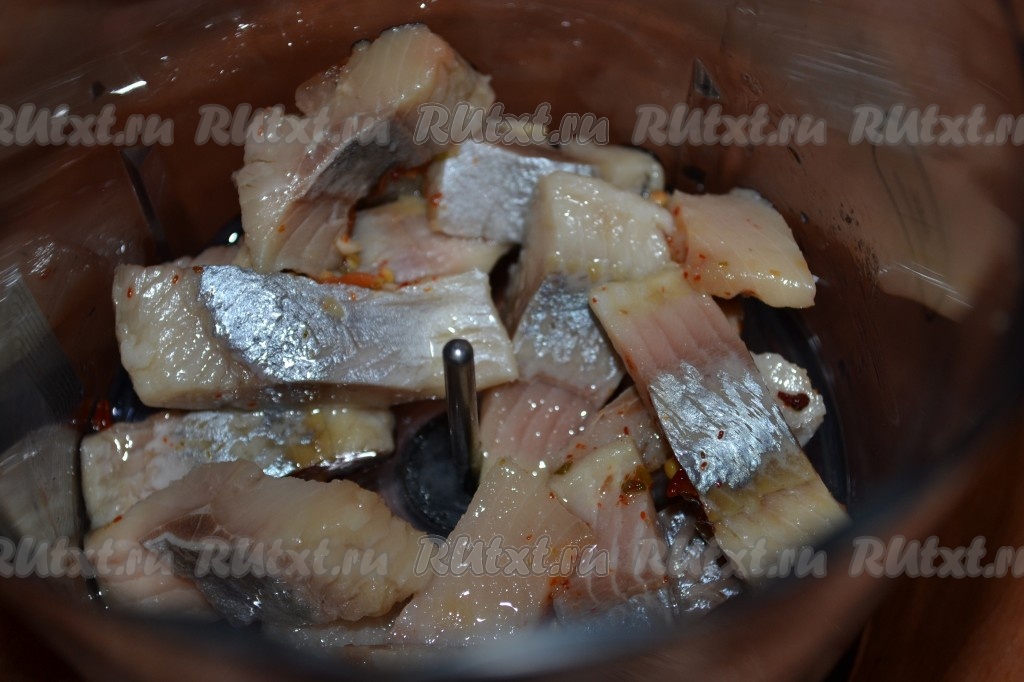 Измельчить сельдь на самой маленькой скорости. Кусочки должны стать очень мелкими, но не измельчайте до состояния паштета.