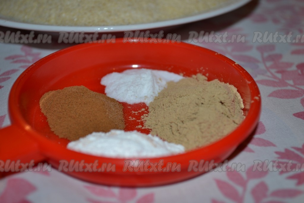 В другой посуде смешать корицу, имбирь и разрыхлитель.