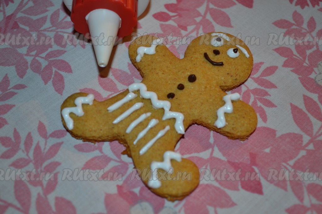 Теперь можно украсить испекшееся печенье с миндалем и медом. Я наполнила кондитерский шприц сахарной глазурью и разрисовала фигурки человечков. Глаза и пуговки украсила растопленным черным шоколадом.
