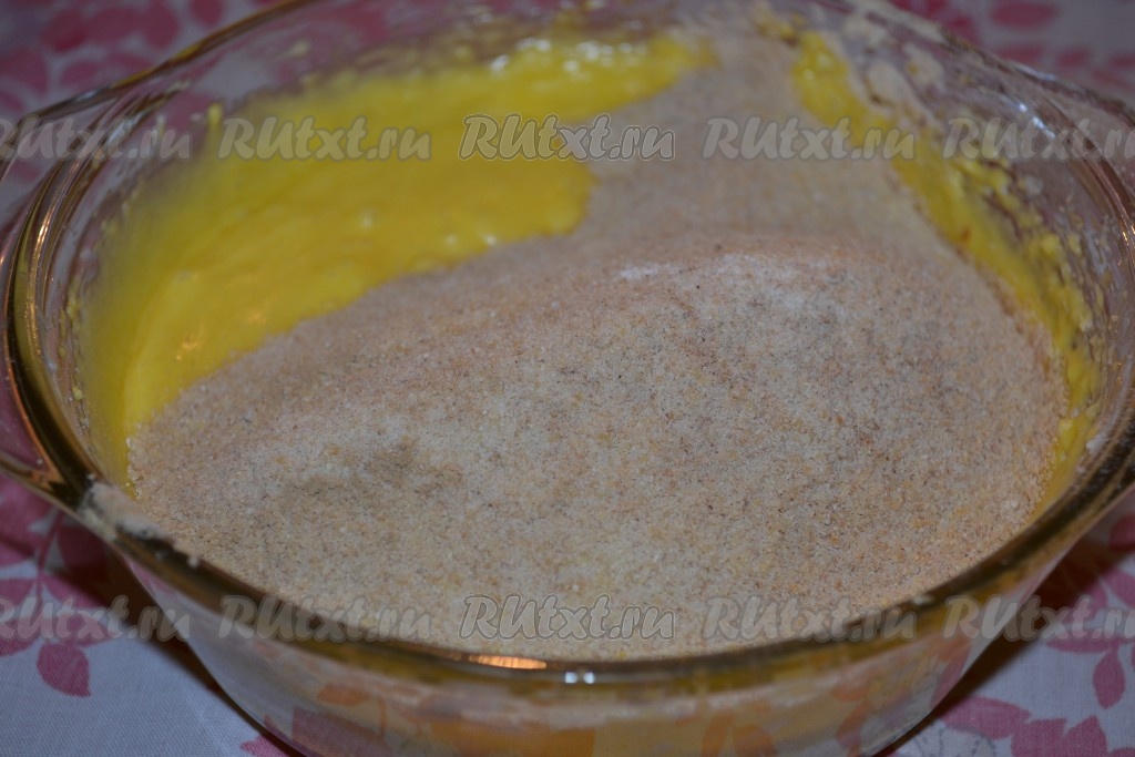 Перемешать все сухие ингредиенты с мукой и постепенно добавлять в масляную смесь.