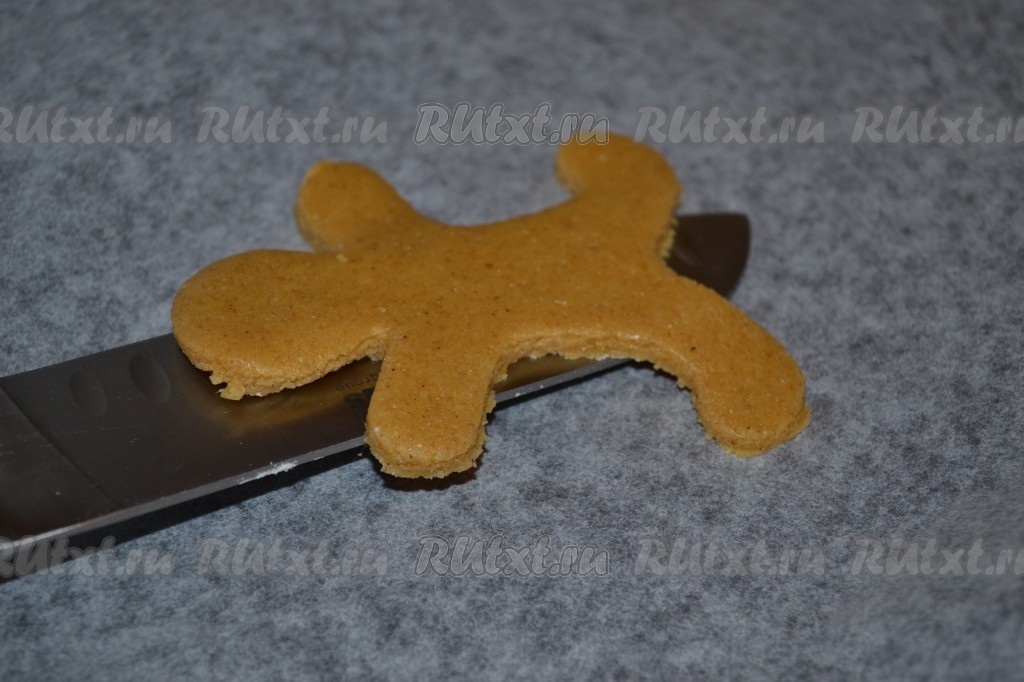Аккуратно, помогая ножом, переложить фигурки на застеленный бумагой для выпечки противень. Выпекать имбирное печенье в разогретой до 180 градусов духовке 15 минут.