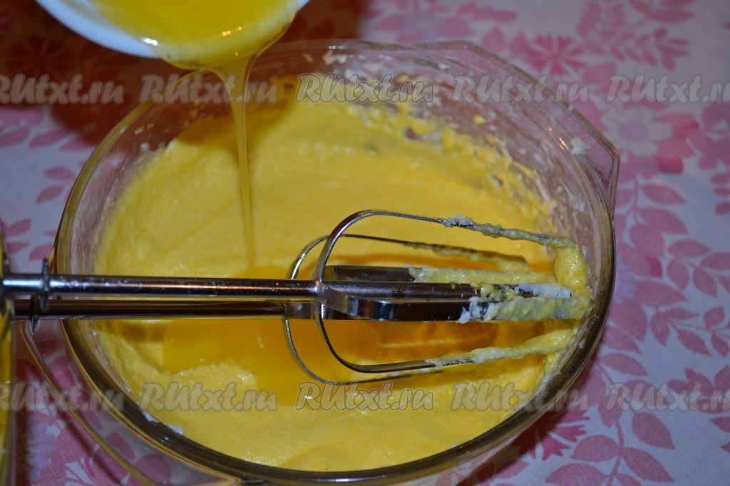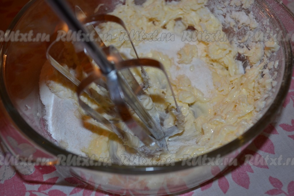 Растаявшее масло соединить со слегка перебитым сахаром. Смешать миксером до однородного состояния.
