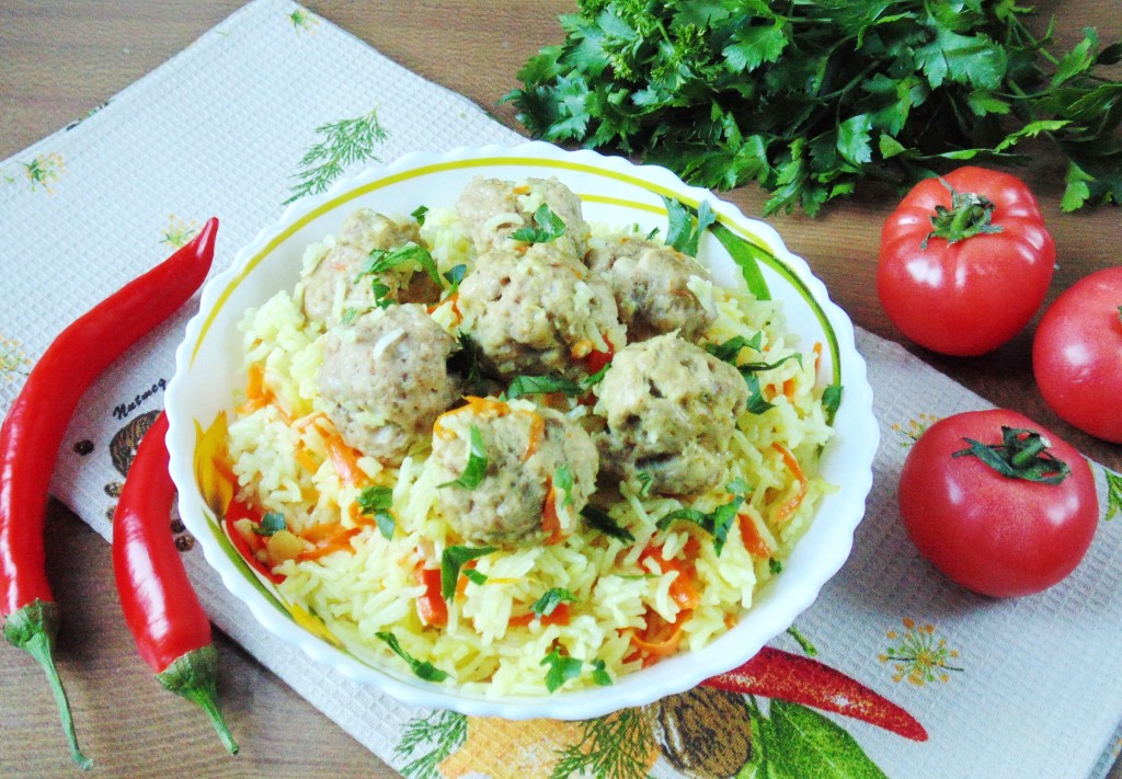 Рассыпчатый рис с нежными фрикадельками раскладываем со сковороды по тарелкам и подаём в горячем виде к столу. Просто, очень вкусно и сытно, попробуйте!