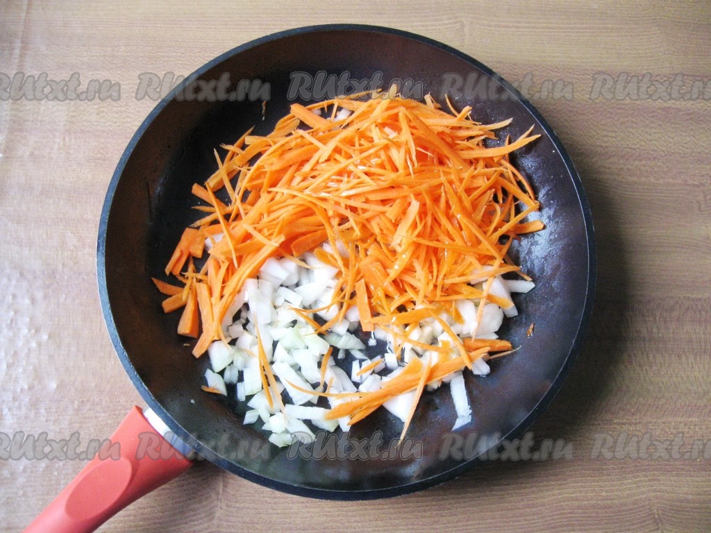 Морковь и луковицу почистить, помыть. Лук мелко нарезать, а морковь натереть на крупной тёрке (или нарезать соломкой). На сковороде прогреть растительное масло, выложить лук с морковью, обжаривать овощи до мягкости (минут 8-10 ) на среднем огне, периодически помешивая.