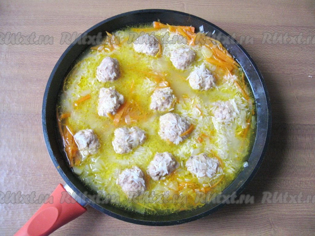 Затем добавить соль, специи вкусу. Рис тщательно промыть под проточной водой, лишней воде дать стечь. Добавить подготовленный рис к фрикаделькам, разровнять. Добавить ещё примерно 50 миллилитров воды (добавляя воду на этом этапе, учитывайте, что вода должна быть на 1,5-2 сантиметра выше уровня риса), накрыть крышкой сковороду, дать воде закипеть. Продолжить готовить блюдо ещё 20-25 минут на небольшом огне. По истечении этого времени рисинки должны стать достаточно мягкими, если рис твердоват, готовьте ещё несколько минут. Если вода выпарится, а рис будет готов не полностью, можно влить в сковороду совсем немного кипящей воды.