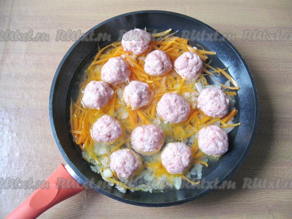 Из фарша влажными руками сформировать фрикадельки размером чуть больше грецкого ореха. Выложить фрикадельки на сковороду с обжаренными луком и морковью.