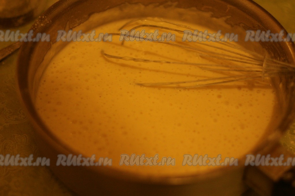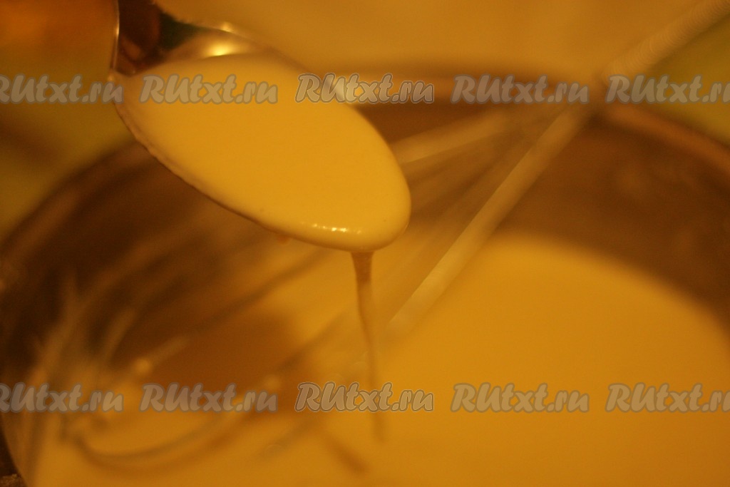 Понемногу добавляем муку. По консистенции тесто должно быть, как сметана, но при этом оно должно литься.