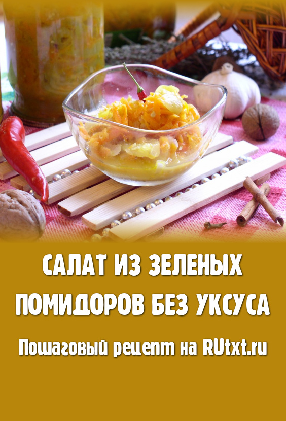 Этот салат из зеленых помидор, приготовленный без уксуса, - прекрасное дополнение к гарнирам в зимнем меню. Кисло-сладкий, с остринкой, витаминный, ароматный и вкусный. Попробуйте!