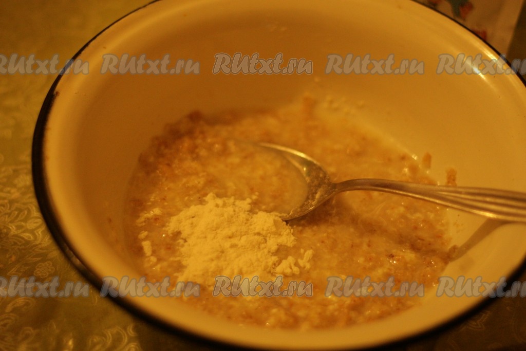 В овсяную кашу добавить сахар и понемногу ввести муку.